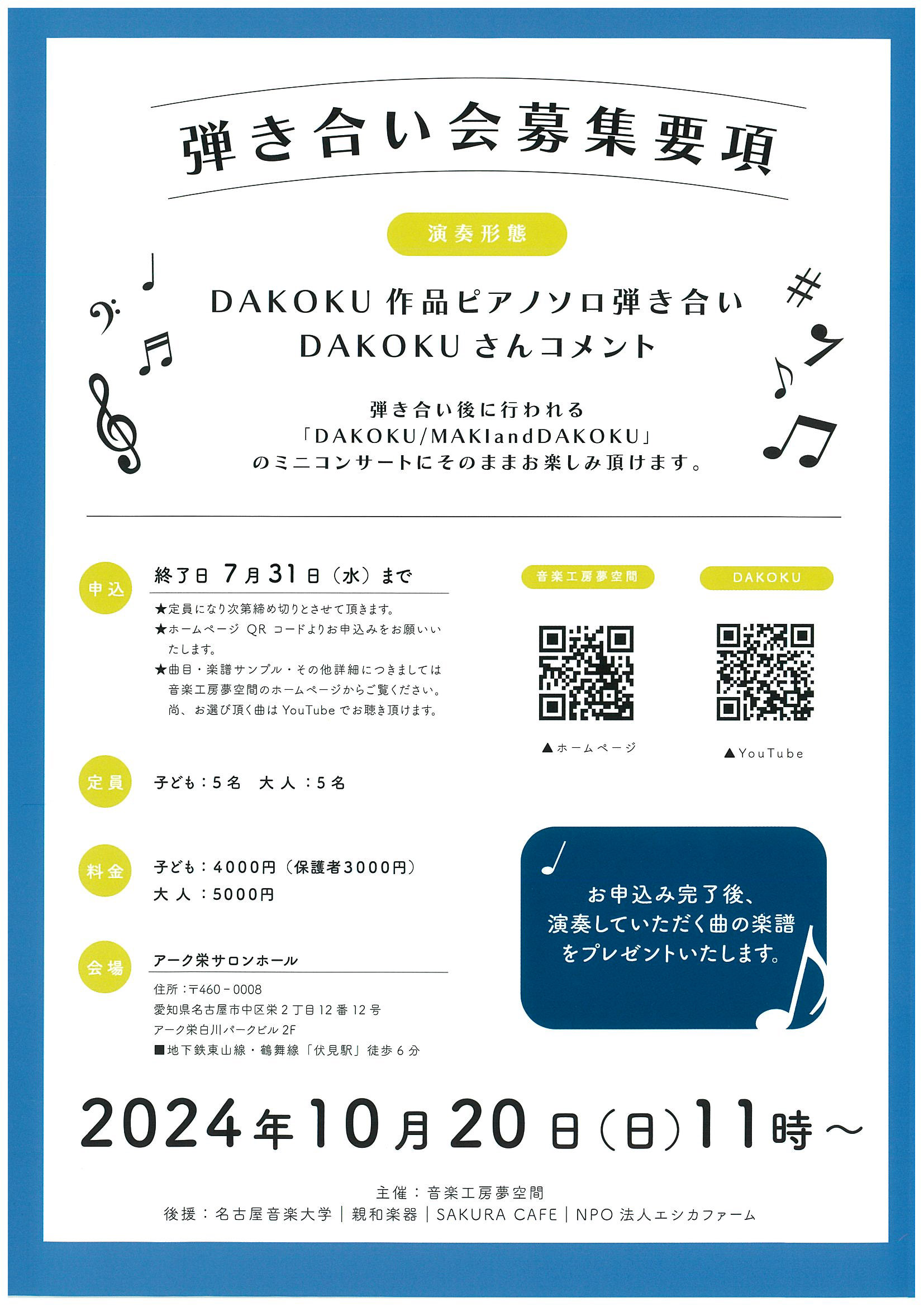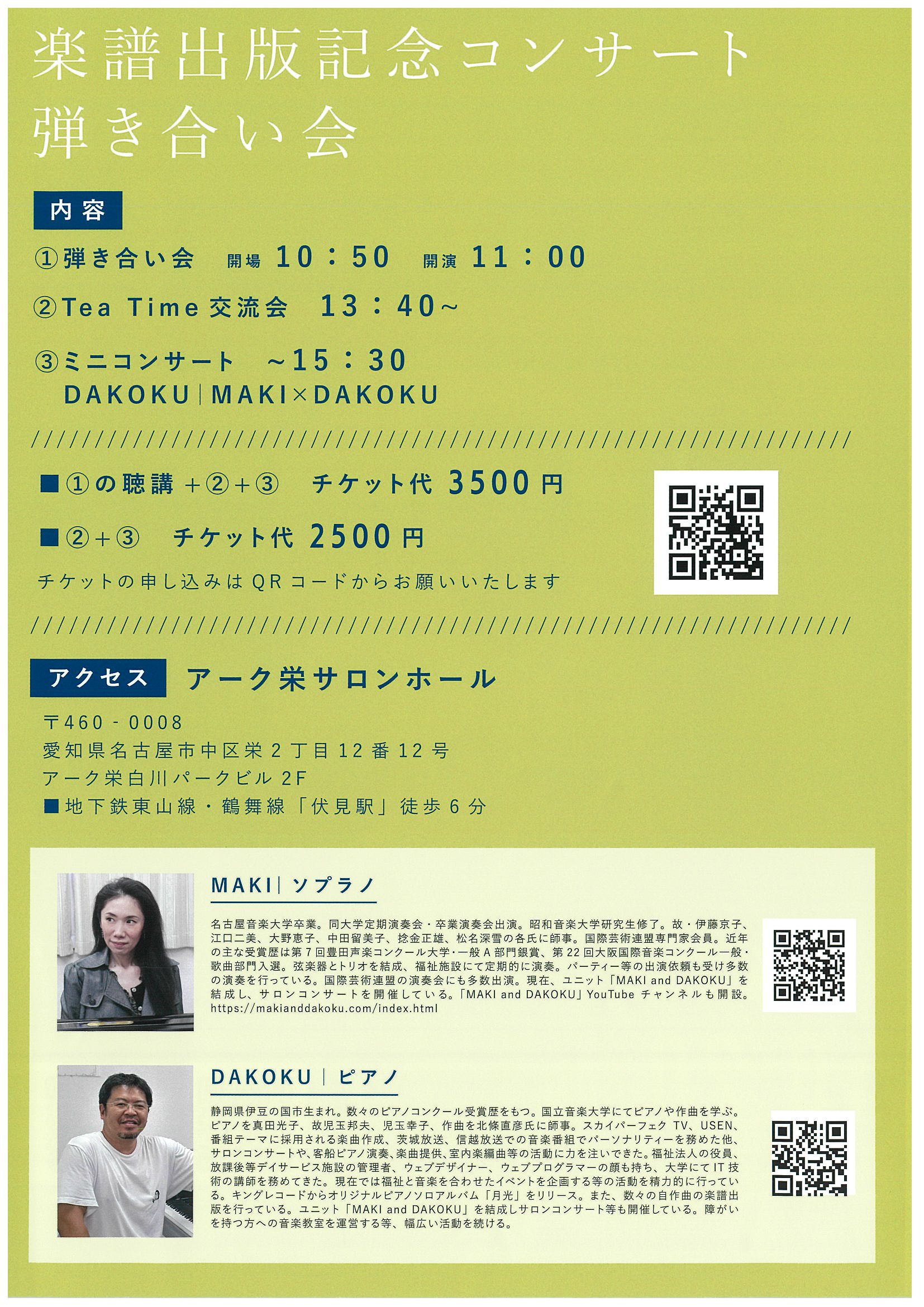 DAKOKU氏からのコメントや、弾き合い会後に行われるミニコンサートをお楽しみ頂けます。